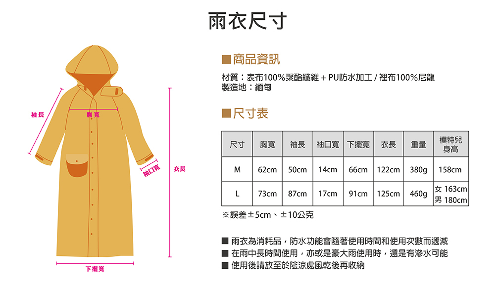 ★袖口內藏鬆緊帶,有效防止雨水滲入