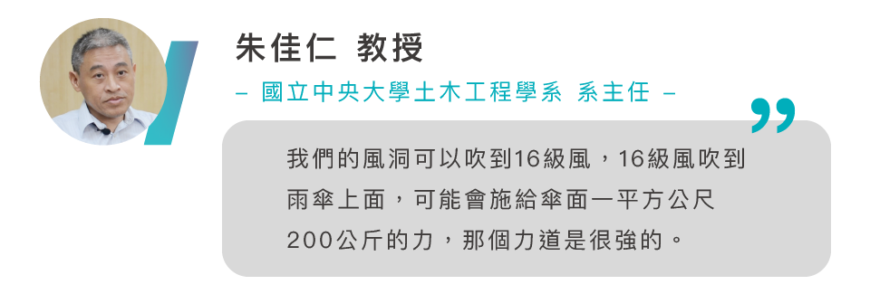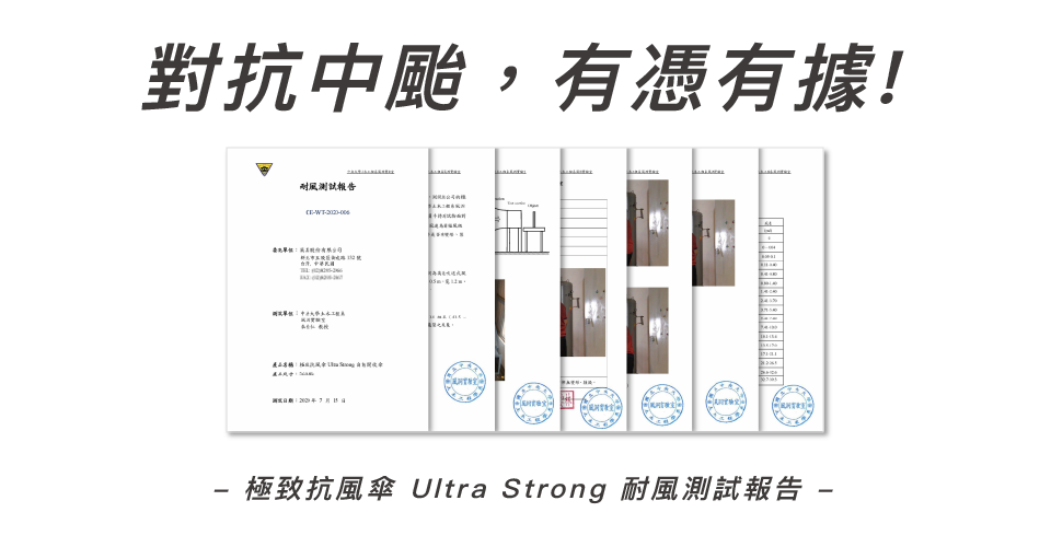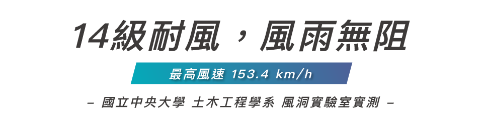 經「中央大學土木工程學系」測試,正面吹拂14級風(最高風速 153.4 km/h)一分鐘,樣品骨架無變形、損毀,通過14級耐風測試。(2020.07.15)