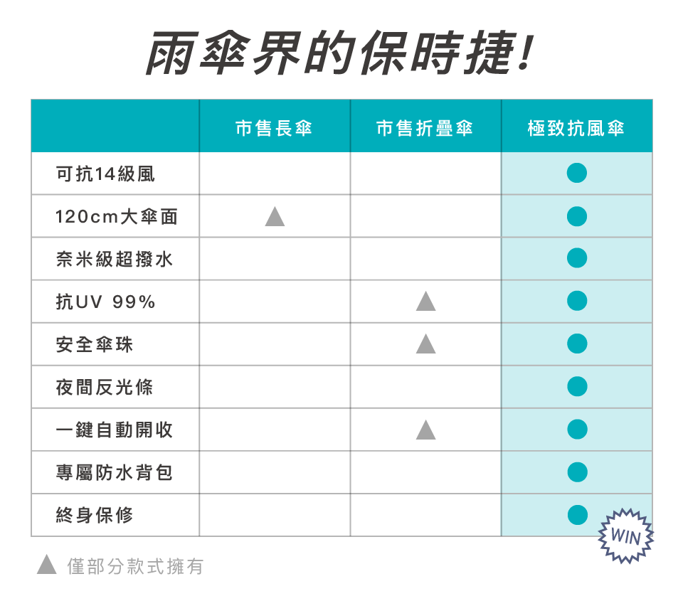 極致抗風傘是專為台灣多變的天氣而設計的雨傘,各方面的能力都超過水平,不論抗強風、大傘面、超撥水、安全設計或是方便攜帶。我們希望帶給你貼心的感受,陪伴你度過每天的日常。